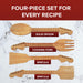 - 🍳 NON-SCRATCH & SAFE FOR ALL COOKWARE Protect your pots and pans! The smooth, polished bamboo is strong enough for serious cooking yet gentle enough to be used on all your cookware without the risk of scratches. This set is perfectly safe for your expensive non-stick pans, cast iron skillets, and stainless steel pots. This complete 4-piece kitchen toolset includes a solid spoon, cooking fork, spatula, and slotted spatula to cover all your culinary needs.